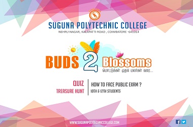 Our College has organized a function named “Buds to Blossoms” for 10th Std students of all schools in Coimbatore.We conducted competitions like Treasure Hunt and Quiz for the students.Mr.Kanagaraj, Hod of Automobile Engg gave an inspiring speech in the topic “How to face Public Exam? ” Our Principal and Academic Coordinator distributed the prizes to the winners.